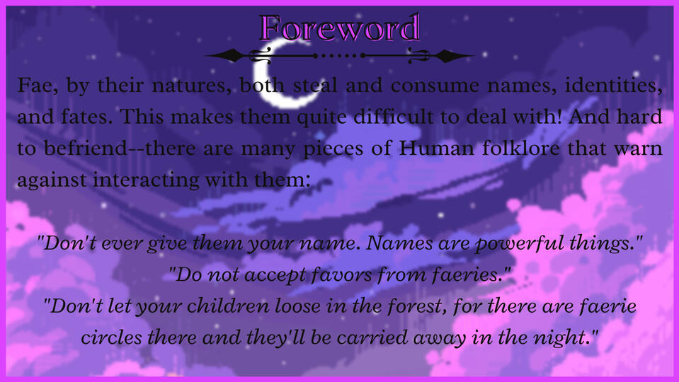 Fae, by their natures, both steal and consume names, identities, and fates. This makes them quite difficult to deal with! And hard to befriend--there are many pieces of Human folklore that warn against interacting with them: