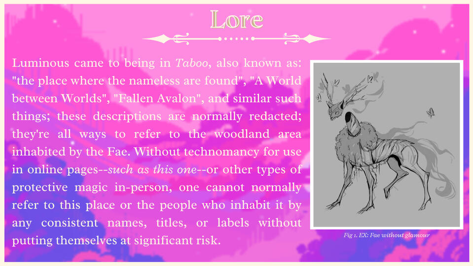 Luminous came to being in Taboo, also known as: "the place where the nameless are found", "A World between Worlds", "Fallen Avalon", and similar such things; these descriptions are normally redacted; they're all ways to refer to the woodland area inhabited by the Fae. Without technomancy for use in online pages--such as this one--or other types of protective magic in-person, one cannot normally refer to this place or the people who inhabit it by any consistent names, titles, or labels without putting themselves at significant risk.